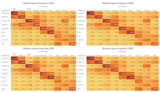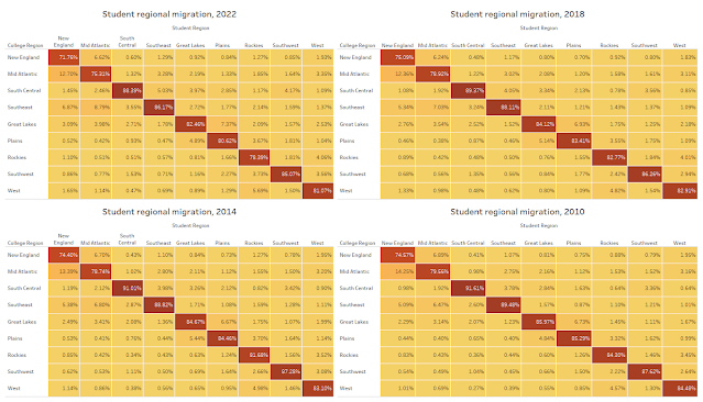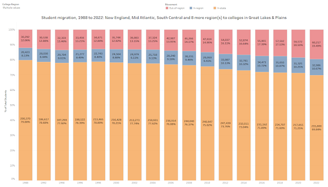 Here is the historical pattern of first-year student migration, from 1988 to 2022. As you can see, about seven of ten students stay in their own state for college, which means the number of students who cross state lines is small, making even big swings in those patterns hard to measure and describe as meaningful. It’s also interesting to note that more students today are more mobile than in the past, for a lot of reasons I won’t go into here, but as always, you can start the finger pointing with Ronald Reagan.