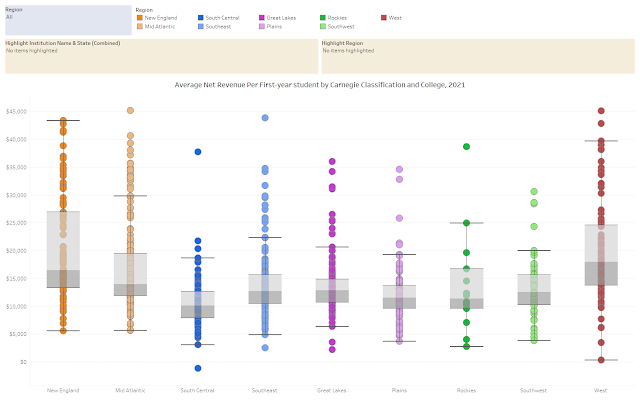 Private colleges in the south net a lot less cash per freshman, too. This does not always mean students pay less, but it’s a pretty sure bet in general it costs less after aid to go south as well. (I only calculate this for private institutions because discount rates at publics are fairly meaningless given different tuition levels and state funding models, in case you were wondering.)