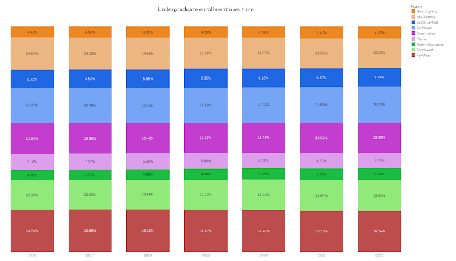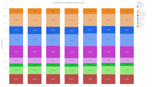 You’ll probably notice that the patterns are about the same, but you see the effect of the California Community Colleges here: Many more students don’t attend four-year colleges in the state, which makes it different from other parts of the country. For reference, here is the same visualization showing all undergraduate enrollment in all institutions (not just in The Filter Set). You’ll note the re-balancing, which is a function of the vast majority of college students going to college close to home.
