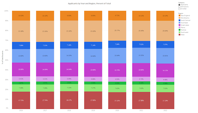 Over time, the percentage of first-year applications submitted has grown in the Southeast, but not the Southcentral region. Actually, what’s remarkable about this chart is the consistency over time.