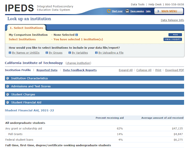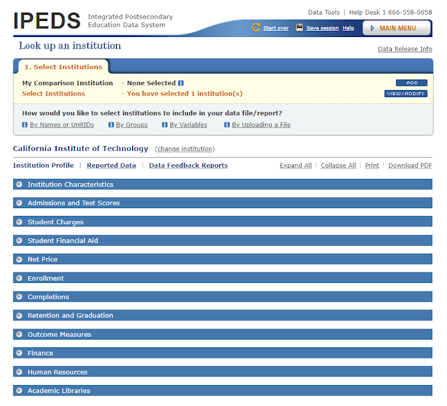 Look Up an Institution allows you to select any single college or university and look at almost all of the information it reports to IPEDS in one place. It can be helpful when you want to look up a few facts about an institution quickly, but otherwise I find little value in it.