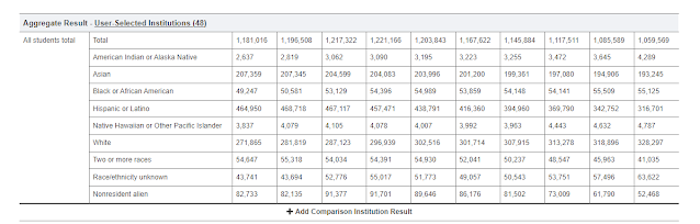 Most, but not all, of the data visualizations on this site use data from IPEDS, the Integrated Postsecondary Education Data System. And all of the visualizations (as I recall) use Tableau, a very powerful data visualization tool, especially for people like me who don’t know how to write the code necessary in some software packages.